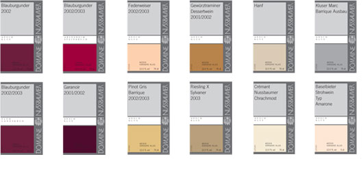 projekt | corporate design für winzerbetrieb. kundin | domaine nussbaumer, aesch medium | broschüre aufgabe | design, typografie, farbcodierung für verschiedene produkte spezial | wettbewerb, nicht realisiert weitere seiten | 1 | 2